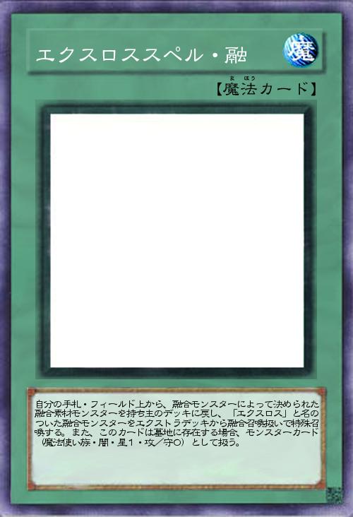 | 自分の手札・フィールド上から、融合モンスターによって決められた融合素材モンスターを持ち主のデッキに戻し、「エクスロス」と名のついた融合モンスターをエクストラデッキから融合召喚扱いで特殊召喚する。また、このカードは墓地に存在する場合、モンスターカード(魔法使い族・闇・星1・攻/守0)として扱う。 | |||