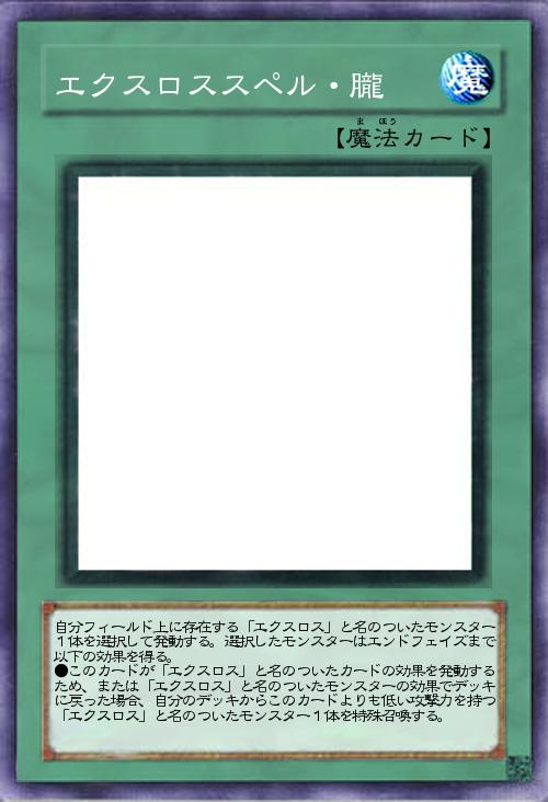 自分フィールド上に存在する「エクスロス」と名のついたモンスター1体を選択して発動する。選択したモンスターはエンドフェイズまで以下の効果を得る。 ●このカードが「エクスロス」と名のついたカードの効果を発動するため、または「エクスロス」と名のついたモンスターの効果でデッキに戻った場合、自分のデッキからこのカードよりも低い攻撃力を持つ「エクスロス」と名のついたモンスター1体を特殊召喚する。 |