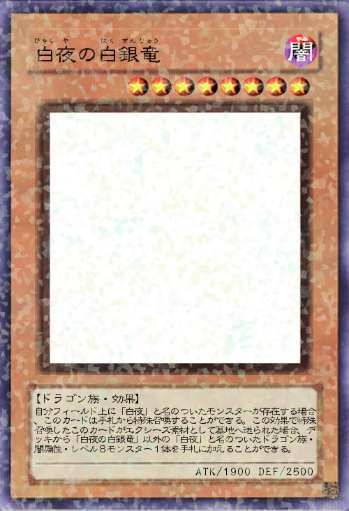 自分フィールド上に「白夜」と名のついたモンスターが存在する場合、このカードは手札から特殊召喚することができる。この効果で特殊召喚したこのカードがエクシーズ素材として墓地へ送られた場合、デッキから「白夜の白銀竜」以外の「白夜」と名のついたドラゴン族・闇属性・レベル8モンスター1体を手札に加えることができる。 |