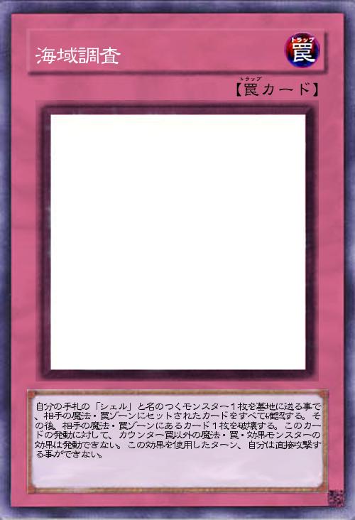 | 自分の手札の「シェル」と名のつくモンスター1枚を墓地に送る事で、相手の魔法・罠ゾーンにセットされたカードをすべて確認する。その後、相手の魔法・罠ゾーンにあるカード1枚を破壊する。このカードの発動に対して、カウンター罠以外の魔法・罠・効果モンスターの効果は発動できない。この効果を使用したターン、自分は直接攻撃する事ができない。 | |||