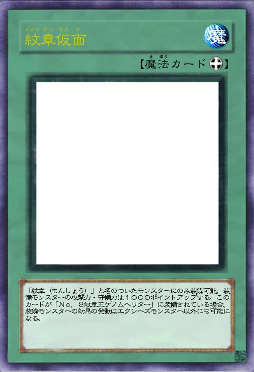 | 「紋章(もんしょう)」と名のついたモンスターにのみ装備可能。装備モンスターの攻撃力・守備力は1000ポイントアップする。このカードが「No.8紋章王ゲノムヘリター」に装備されている場合、装備モンスターの効果の発動はエクシーズモンスター以外にも可能になる。 | |||