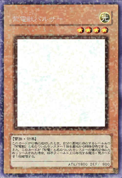 「ストーリー・・とあるモンスターの登場により、戦況は一変した。劣勢だった紫電獣の一匹、パルサーが倒れた仲間を蘇らせ、新たな紫電陣を引き、儀式を始めた。阻止しようと竜装鬼が攻撃を仕掛けるも、紫電獣達は彼らが外敵の襲来に備え作っていた兵器「紫電砲-迅雷」により竜装鬼の攻撃を防ぎ、返り討ちにした。/紫電獣は展開からの儀式+儀式素材になったときに効果を発動する+エクシーズもあるよというテーマにしようと思ってます。」(2012-11-03 23:01)