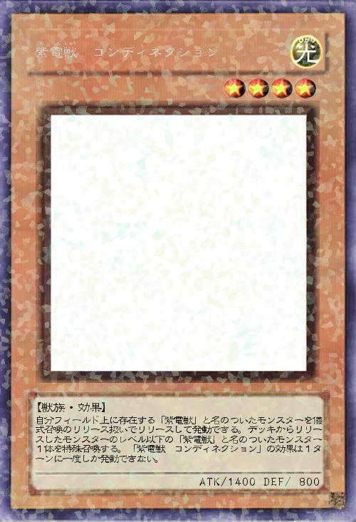 | 自分フィールド上に存在する「紫電獣」と名のついたモンスターを儀式召喚のリリース扱いでリリースして発動できる。デッキからリリースしたモンスターのレベル以下の「紫電獣」と名のついたモンスター1体を特殊召喚する。「紫電獣 コンディネクション」の効果は1ターンに一度しか発動できない。 | |||