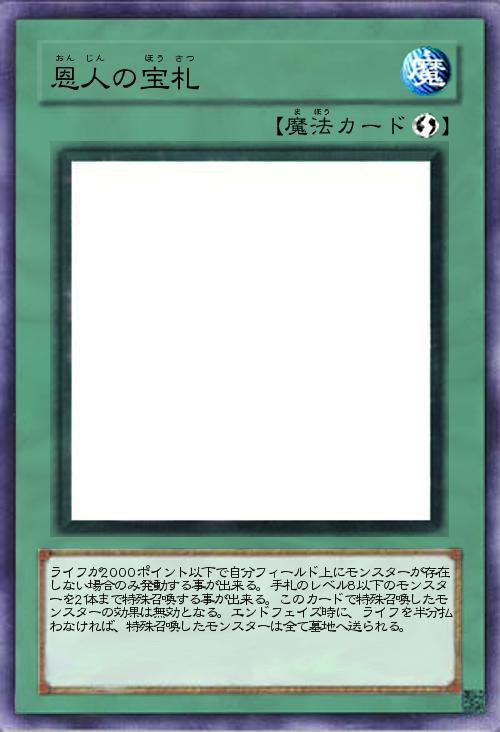 | ライフが2000ポイント以下で自分フィールド上にモンスターが存在しない場合のみ発動する事が出来る。手札のレベル8以下のモンスターを2体まで特殊召喚する事が出来る。このカードで特殊召喚したモンスターの効果は無効となる。エンドフェイズ時に、ライフを半分払わなければ、特殊召喚したモンスターは全て墓地へ送られる。 | |||