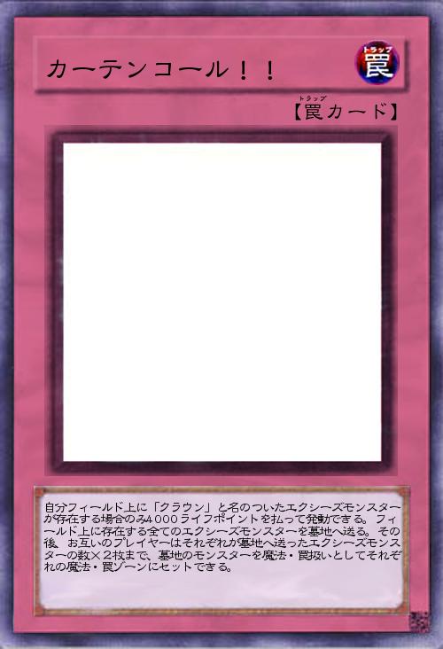 | 自分フィールド上に「クラウン」と名のついたエクシーズモンスターが存在する場合のみ4000ライフポイントを払って発動できる。フィールド上に存在する全てのエクシーズモンスターを墓地へ送る。その後、お互いのプレイヤーはそれぞれが墓地へ送ったエクシーズモンスターの数×2枚まで、墓地のモンスターを魔法・罠扱いとしてそれぞれの魔法・罠ゾーンにセットできる。 | |||