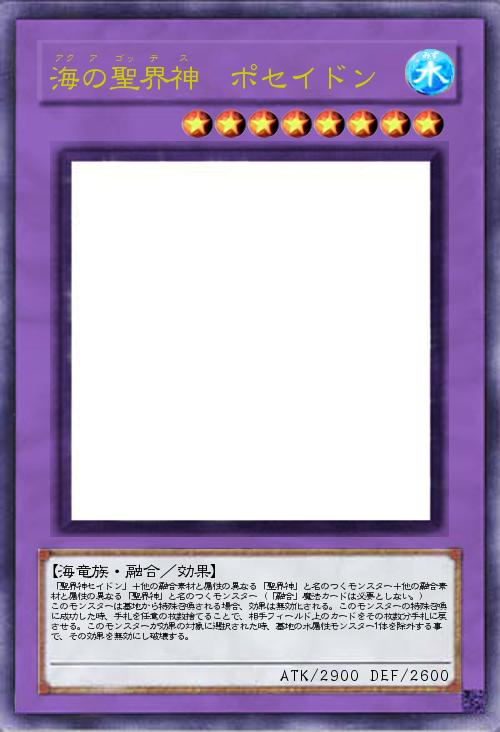 「聖界神セイドン」+他の融合素材と属性の異なる「聖界神」と名のつくモンスター+他の融合素材と属性の異なる「聖界神」と名のつくモンスター(「融合」魔法カードは必要としない。) このモンスターは墓地から特殊召喚される場合、効果は無効化される。このモンスターの特殊召喚に成功した時、手札を任意の枚数捨てることで、相手フィールド上のカードをその枚数分手札に戻させる。このモンスターが効果の対象に選択された時、墓地の水属性モンスター1体を除外する事で、その効果を無効にし破壊する。 |