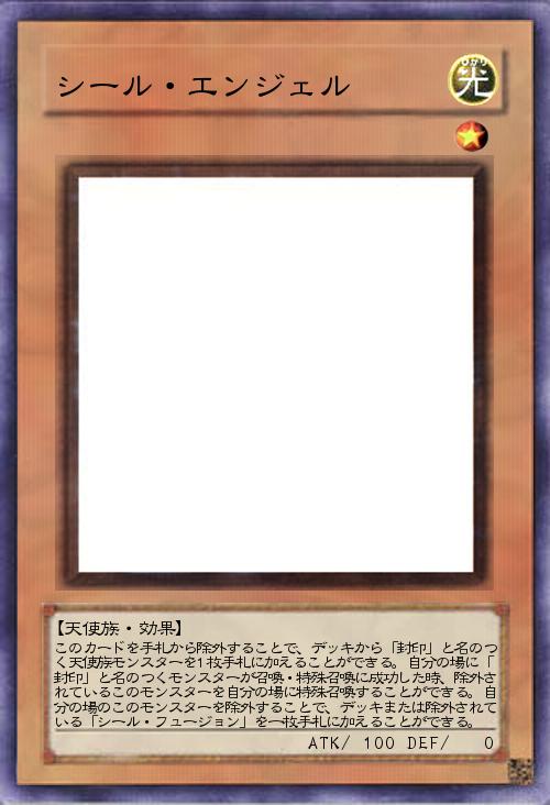 | このカードを手札から除外することで、デッキから「封印」と名のつく天使族モンスターを1枚手札に加えることができる。自分の場に「封印」と名のつくモンスターが召喚・特殊召喚に成功した時、除外されているこのモンスターを自分の場に特殊召喚することができる。自分の場のこのモンスターを除外することで、デッキまたは除外されている「シール・フュージョン」を一枚手札に加えることができる。 | |||