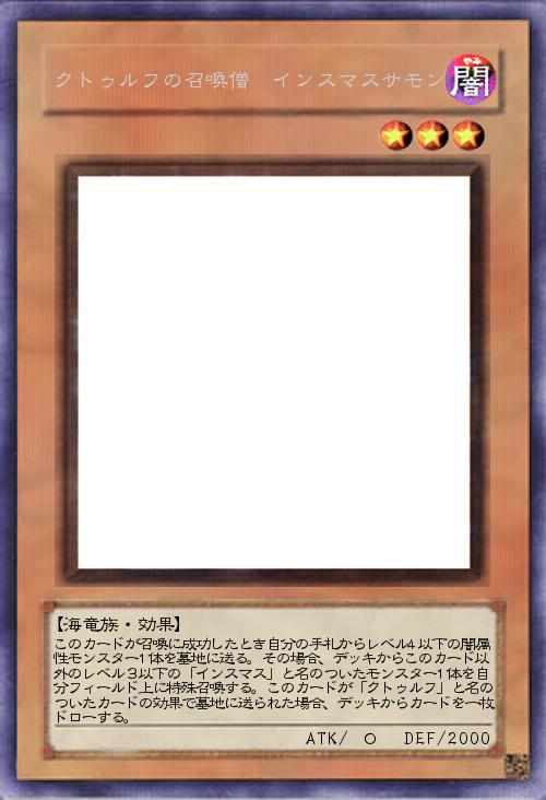 | このカードが召喚に成功したとき自分の手札からレベル4以下の闇属性モンスター1体を墓地に送る。その場合、デッキからこのカード以外のレベル3以下の「インスマス」と名のついたモンスター1体を自分フィールド上に特殊召喚する。このカードが「クトゥルフ」と名のついたカードの効果で墓地に送られた場合、デッキからカードを一枚ドローする。 | |||