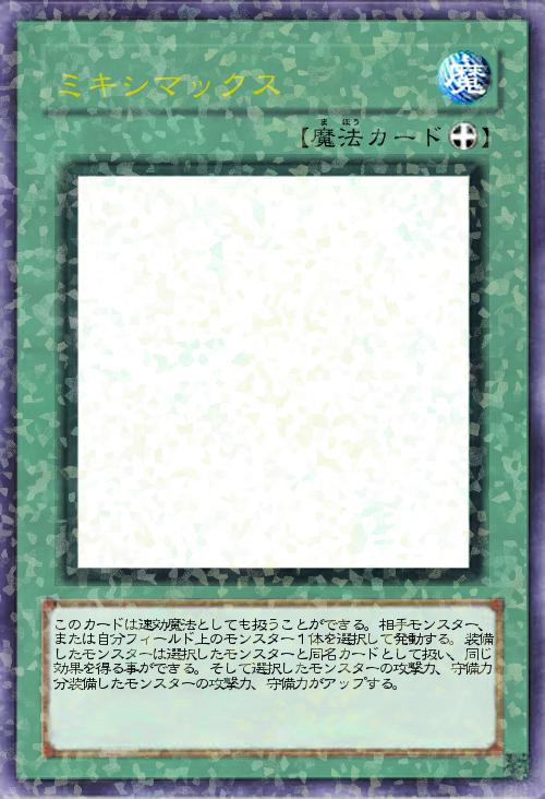 | このカードは速効魔法としても扱うことができる。相手モンスター、または自分フィールド上のモンスター1体を選択して発動する。装備したモンスターは選択したモンスターと同名カードとして扱い、同じ効果を得る事ができる。そして選択したモンスターの攻撃力、守備力分装備したモンスターの攻撃力、守備力がアップする。 | |||