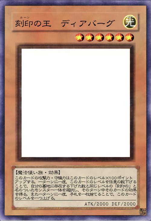 | このカードの攻撃力・守備力はこのカードのレベル×100ポイントアップする。一ターンに一度、このカードのレベルを任意の数下げることで、自分の墓地に存在する下げた数と同じレベルの「刻印の」と名のついたモンスター一体を選択し、そのターン中そのカードの効果を得る。また一ターンに一度、手札を一枚捨てることで、このカードのレベルを一つ上げる。 | |||