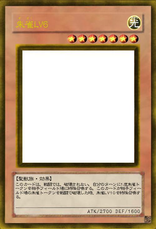 | このカードは、戦闘では、破壊されない。自分のターンに1度朱雀トークンを相手フィールド場に特殊召喚する。このカードが相手フィールド場の朱雀トークンを戦闘で破壊した時、朱雀LV10を特殊召喚する。 | |||