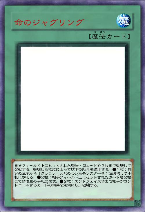 「クラウンのロマンカード(多分)。1つ目の効果はサルベージ。2つ目の効果は対象を取らないバウンス。3つ目の効果はユニコールとローザリアンが合わさったようなもの。カウンター罠も永続効果も無効にします。ただ、クラウン自体全体的に火力が低く1キルが成立しにくいのが残念なところ(ぁ」(2012-11-11 15:35)