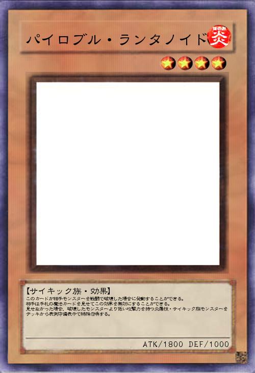 このカードが相手モンスターを戦闘で破壊した場合に発動することができる。 相手は手札の魔法カードを見せてこの効果を無効にすることができる。 見せなかった場合、破壊したモンスターより低い攻撃力を持つ炎属性・サイキック族モンスターをデッキから表側守備表示で特殊召喚する。 |