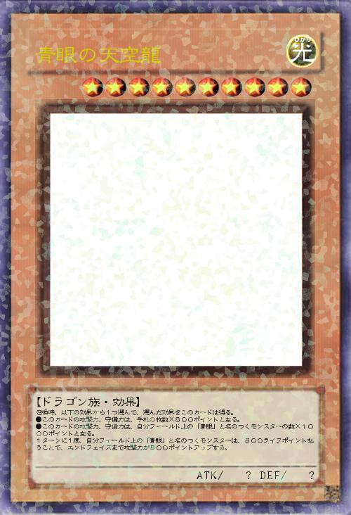 召喚時、以下の効果から1つ選んで、選んだ効果をこのカードは得る。 ●このカードの攻撃力、守備力は、手札の枚数×800ポイントとなる。 ●このカードの攻撃力、守備力は、自分フィールド上の「青眼」と名のつくモンスターの数×1000ポイントとなる。 1ターンに1度、自分フィールド上の「青眼」と名のつくモンスターは、500ライフポイント払うことで、エンドフェイズまで攻撃力が500ポイントアップする。 |