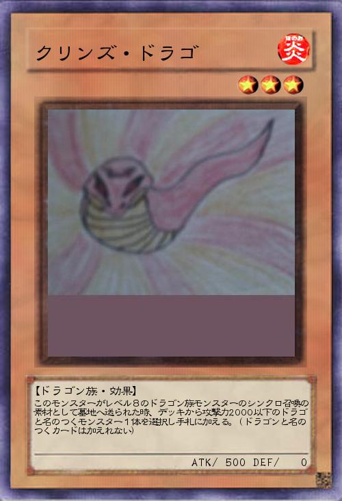 | このモンスターがレベル8のドラゴン族モンスターのシンクロ召喚の素材として墓地へ送られた時、デッキから攻撃力2000以下のドラゴと名のつくモンスター1体を選択し手札に加える。(ドラゴンと名のつくカードは加えれない) | |||