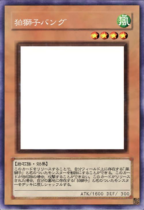 | このカードをリリースすることで、自分フィールド上に存在する「風獅子」と名のついたモンスターを獣族にすることができる。このカードが岩石族の場合、攻撃することができない。このカードがリリースされた場合、自分の墓地に存在する「狛獅子」と名のついたモンスターをデッキに戻しシャッフルする。 | |||