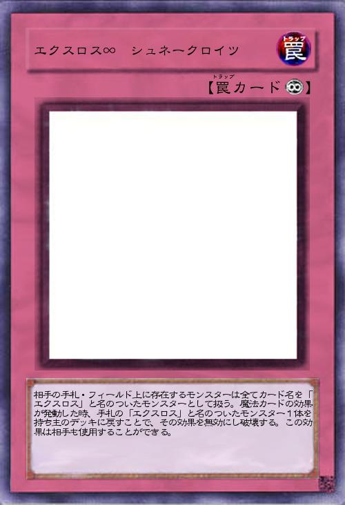 | 相手の手札・フィールド上に存在するモンスターは全てカード名を「エクスロス」と名のついたモンスターとして扱う。魔法カードの効果が発動した時、手札の「エクスロス」と名のついたモンスター1体を持ち主のデッキに戻すことで、その効果を無効にし破壊する。この効果は相手も使用することができる。 | |||