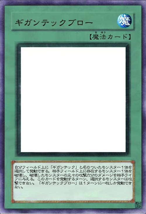 | 自分フィールド上に「ギガンテック」と名のついたモンスター1体を選択して発動できる。相手フィールド上に存在するモンスター1体を破壊し、破壊したモンスターの元々の攻撃力分のダメージを相手ライフに与える。このカードを発動するターン、選択するモンスターは攻撃できない。「ギガンテックブロー」は1ターンに一枚しか発動できない。 | |||