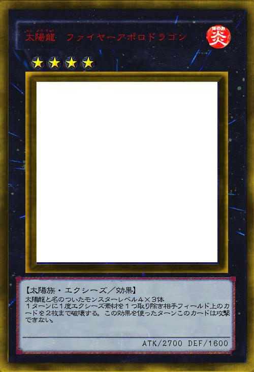 太陽龍と名のついたモンスターレベル4×3体 1ターンに1度エクシーズ素材を1つ取り除き相手フィールド上のカードを2枚まで破壊する。この効果を使ったターンこのカードは攻撃できない。 |