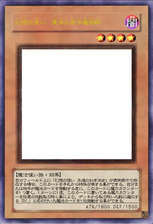 | 自分フィールド上に「幻想の使い 永遠の紅き巫女」が表側表示で存在する場合、このカードを手札から特殊召喚する事ができる。自分または相手が魔法カードを発動する度に、このカードに魔力カウンターを1つ置く。1ターンに1度、このカードに置いてある魔力カウンターを任意の枚数取り除く事により、デッキから取り除いた数に適応する「SC」と名の付いた魔法カードを1枚発動する事ができる。 | |||