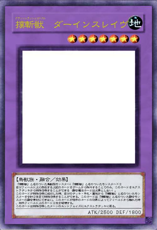 「撲斬獣」と名のついた鳥獣族モンスター+「撲斬獣」と名のついたモンスター×2 自分フィールド上に存在する上記のカードをゲームから除外することでのみ、このカードをエクストラデッキから特殊召喚することができる(融合魔法カードは必要としない)。 このカードが特殊召喚に成功した時、自分のデッキ・手札・墓地から「撲斬獣」と名のついたモンスターを合計2体まで特殊召喚することができる。このカードは「撲斬獣」と名のついた融合モンスターの融合素材にできない。このカードが相手のカードの効果によってフィールドから離れた時、相手フィールド上のカード2枚を破壊する。 このカードは特殊召喚したターンのエンドフェイズにエクストラデッキに戻る。 |