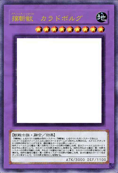 「撲斬獣」と名のついた獣戦士族モンスター+「撲斬獣」と名のついたモンスター2体以上 このカードは自分フィールド上の上記のカードをゲームから除外した場合のみ、エクストラデッキから特殊召喚することができる(融合魔法カードは必要としない)。 相手フィールド上で魔法・罠・効果モンスターの効果が発動した時、自分フィールド上のカード1枚を手札に戻すことで、そのカードの効果を無効にし破壊する。相手の手札から魔法・罠・効果モンスターの効果が発動した時、手札を1枚墓地に捨てること事で、そのカードの効果を無効にし破壊する。相手の墓地で魔法・罠・効果モンスターの効果が発動した時、自分の墓地のカード1枚をデッキに戻すことで、その効果を無効にし破壊する。 |