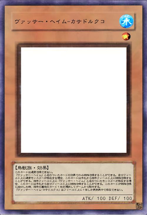 このカードは通常召喚できない。 「ヴァッサー・ヘイム」と名のついたカードの効果でのみ特殊召喚することができる。自分フィールド上に通常モンスターが存在する場合、このカードは手札から相手フィールド上に特殊召喚することができる。相手フィールド上に「ヴァッサー・ヘイム」と名のついたモンスターが存在する場合、このカードは手札から自分フィールド上に特殊召喚することができる。このカードが特殊召喚に成功した時、相手の墓地のカード1枚を選択してゲームから除外する。 「ヴァッサー・ヘイム-カサドルクコ」はフィールド上に1体しか表側表示で存在できない。 |