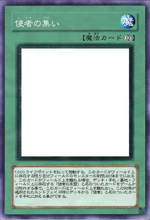 | 1000ライフポイントを払って発動する。このカードがフィールド上に存在する限り自分フィールドのモンスターの制限は6体までになる。このカードがフィールド上を離れる場合、デッキ・手札・墓地・フィールド上に存在する「使者の末裔」と名のついたカードをゲームから除外する事で、このカードはフィールド上を離れない。この効果が適用されたエンドフェイズ時にデッキから「使者」と名のついたカードを手札に加える事ができる。 | |||