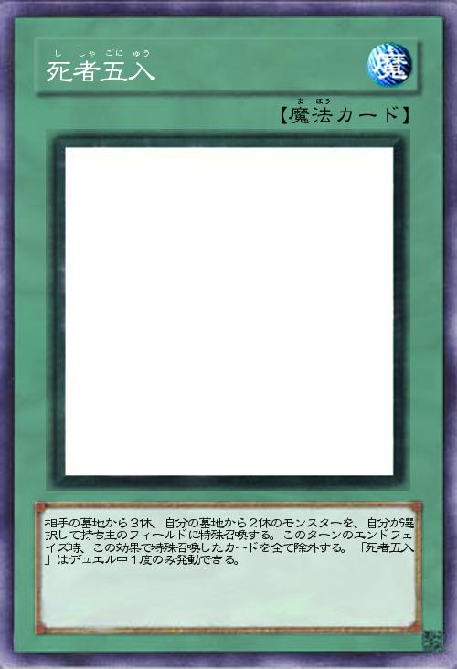 | 相手の墓地から3体、自分の墓地から2体のモンスターを、自分が選択して持ち主のフィールドに特殊召喚する。このターンのエンドフェイズ時、この効果で特殊召喚したカードを全て除外する。「死者五入」はデュエル中1度のみ発動できる。 | |||