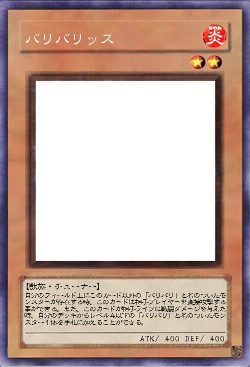 | 自分のフィールド上にこのカード以外の「バリバリ」と名のついたモンスターが存在する時、このカードは相手プレイヤーを直接攻撃する事ができる。また、このカードが相手ライフに戦闘ダメージを与えた時、自分のデッキからレベル4以下の「バリバリ」と名のついたモンスター1体を手札に加えることができる。 | |||