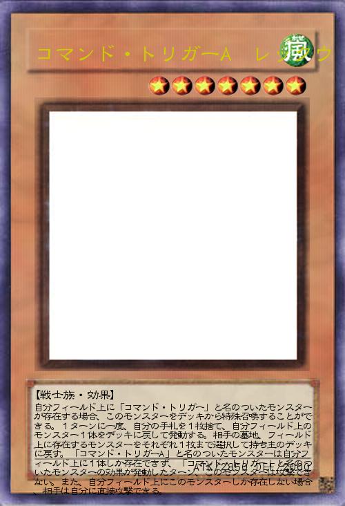 | 自分フィールド上に「コマンド・トリガー」と名のついたモンスターが存在する場合、このモンスターをデッキから特殊召喚することができる。1ターンに一度、自分の手札を1枚捨て、自分フィールド上のモンスター1体をデッキに戻して発動する。相手の墓地、フィールド上に存在するモンスターをそれぞれ1枚まで選択して持ち主のデッキに戻す。「コマンド・トリガーA」と名のついたモンスターは自分フィールド上に1体しか存在できず、「コマンド・トリガー」と名のついたモンスターの効果が発動したターン、このモンスターは攻撃できない。また、自分フィールド上にこのモンスターしか存在しない場合、相手は自分に直接攻撃できる。 | |||