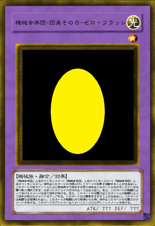 | 「機械音楽団」と名のつくモンスター+「機械音楽団」と名のつくモンスター+「機械音楽団」と名のつくモンスター。相手はこのカードの召喚に対してカードの効果を発動することが出来ない。このカードが自分フィールド上に表側表示で存在する限り相手はこのカード以外のモンスターを攻撃対象に選択できず、必ずバトルフェイズを行わなくてはならない。また、このカードの戦闘によって受けるダメージは全て相手が受ける。また、このカードの攻撃力はこのカードとの戦闘によって相手が受けたダメージ分アップする。このカードは攻撃宣言をすることが出来ない。このカードは戦闘では破壊されない。このカードが戦闘以外で破壊された時、相手はこのカードの攻撃力分ダメージを受ける。このカードのプレイヤーは1ターンに1000ポイントダメージを受ける。 | |||