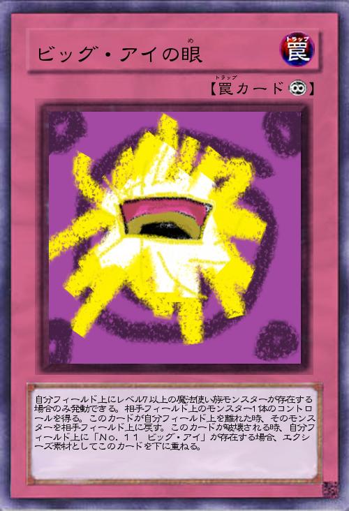| 自分フィールド上にレベル7以上の魔法使い族モンスターが存在する場合のみ発動できる。相手フィールド上のモンスター1体のコントロールを得る。このカードが自分フィールド上を離れた時、そのモンスターを相手フィールド上に戻す。このカードが破壊される時、自分フィールド上に「No.11 ビッグ・アイ」が存在する場合、エクシーズ素材としてこのカードを下に重ねる。 | |||