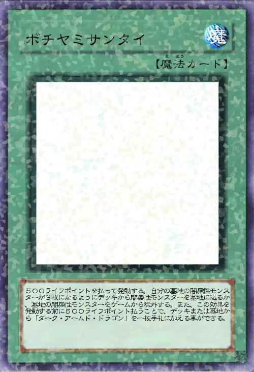 500ライフポイントを払って発動する。自分の墓地の闇属性モンスターが3枚になるようにデッキから闇属性モンスターを墓地に送るか、墓地の闇属性モンスターをゲームから除外する。また、この効果を発動する前に500ライフポイント払うことで、デッキまたは墓地から「ダーク・アームド・ドラゴン」を一枚手札に加える事ができる。 |