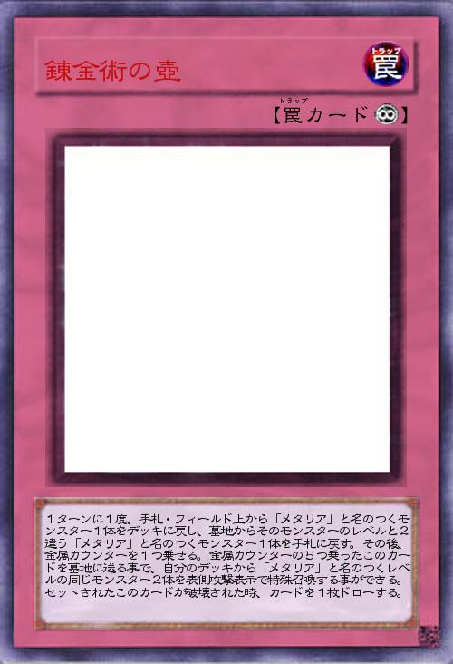 | 1ターンに1度、手札・フィールド上から「メタリア」と名のつくモンスター1体をデッキに戻し、墓地からそのモンスターのレベルと2違う「メタリア」と名のつくモンスター1体を手札に戻す。その後、金属カウンターを1つ乗せる。金属カウンターの5つ乗ったこのカードを墓地に送る事で、自分のデッキから「メタリア」と名のつくレベルの同じモンスター2体を表側攻撃表示で特殊召喚する事ができる。セットされたこのカードが破壊された時、カードを1枚ドローする。 | |||