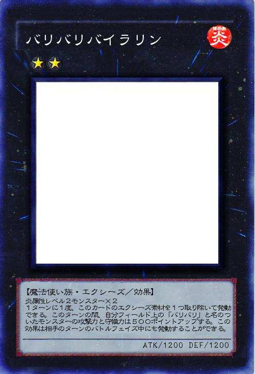 炎属性レベル2モンスター×2 1ターンに1度、このカードのエクシーズ素材を1つ取り除いて発動できる。このターンの間、自分フィールド上の「バリバリ」と名のついたモンスターの攻撃力と守備力は500ポイントアップする。この効果は相手のターンのバトルフェイズ中にも発動することができる。 |