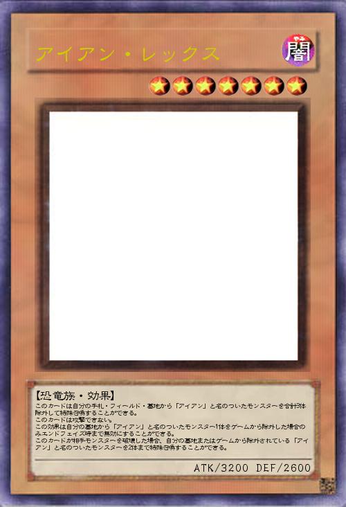 このカードは自分の手札・フィールド・墓地から「アイアン」と名のついたモンスターを合計3体除外して特殊召喚することができる。 このカードは攻撃できない。 この効果は自分の墓地から「アイアン」と名のついたモンスター1体をゲームから除外した場合のみエンドフェイズ時まで無効にすることができる。 このカードが相手モンスターを破壊した場合、自分の墓地またはゲームから除外されている「アイアン」と名のついたモンスターを2体まで特殊召喚することができる。 |