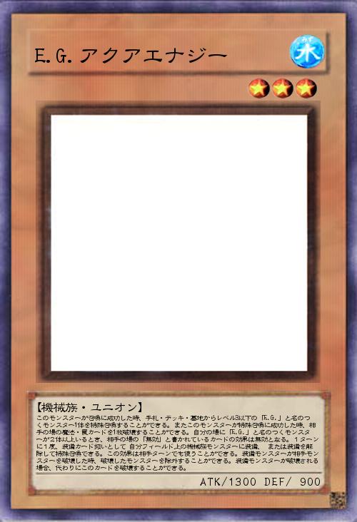 | このモンスターが召喚に成功した時、手札・デッキ・墓地からレベル3以下の「E.G.」と名のつくモンスター1体を特殊召喚することができる。またこのモンスターが特殊召喚に成功した時、相手の場の魔法・罠カードを1枚破壊することができる。自分の場に「E.G.」と名のつくモンスターが2体以上いるとき、相手の場の「無効」と書かれているカードの効果は無効となる。1ターンに1度、装備カード扱いとして 自分フィールド上の機械族モンスターに装備、 または装備を解除して特殊召喚できる。この効果は相手ターンでも使うことができる。装備モンスターが相手モンスターを破壊した時、破壊したモンスターを除外することができる。装備モンスターが破壊される場合、代わりにこのカードを破壊することができる。 | |||