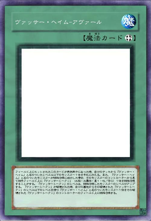 | フィールド上にセットされたこのカードが表側表示になった時、自分のデッキから「ヴァッサー・ヘイム」と名のついたレベル4以下のモンスター1体を手札に加える。また、「ヴァッサー・ヘイム」と名のついたモンスターが特殊召喚に成功した場合、そのモンスターのコントローラーから見て相手フィールド上に「ヴァッサートークン」(水族・水属性・星1・攻/守0)1体を特殊召喚することがする。「ヴァッサートークン」のレベルは、特殊召喚したモンスターのレベル分アップする。「ヴァッサートークン」が破壊された時、自分の墓地からその破壊された「ヴァッサートークン」のレベル以下のレベルを持つ「ヴァッサー・ヘイム」と名のついたモンスター1体をその破壊された「ヴァッサートークン」のコントローラーのフィールド上に特殊召喚する。 | |||