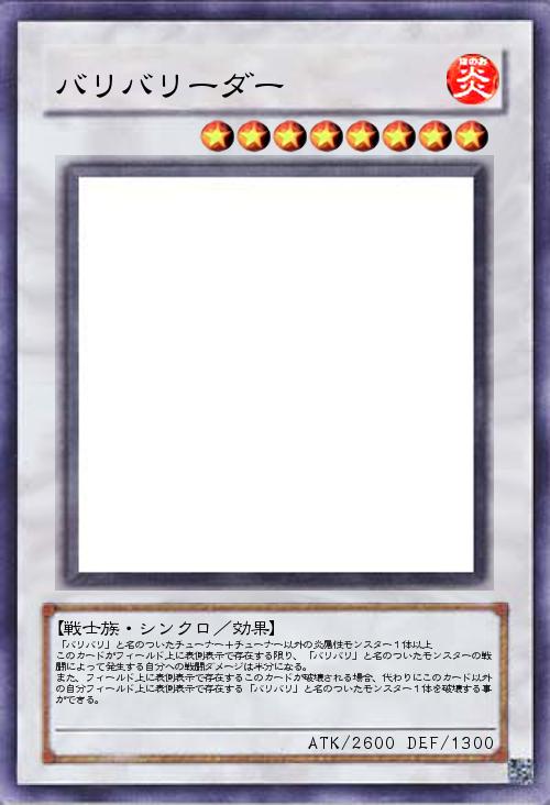 「バリバリ」と名のついたチューナー+チューナー以外の炎属性モンスター1体以上 このカードがフィールド上に表側表示で存在する限り、「バリバリ」と名のついたモンスターの戦闘によって発生する自分への戦闘ダメージは半分になる。 また、フィールド上に表側表示で存在するこのカードが破壊される場合、代わりにこのカード以外の自分フィールド上に表側表示で存在する「バリバリ」と名のついたモンスター1体を破壊する事ができる。 |