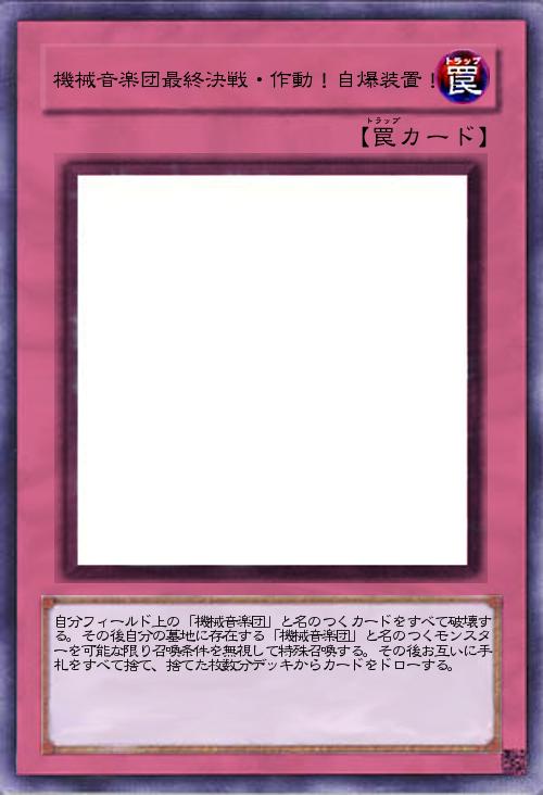 | 自分フィールド上の「機械音楽団」と名のつくカードをすべて破壊する。その後自分の墓地に存在する「機械音楽団」と名のつくモンスターを可能な限り召喚条件を無視して特殊召喚する。その後お互いに手札をすべて捨て、捨てた枚数分デッキからカードをドローする。 | |||