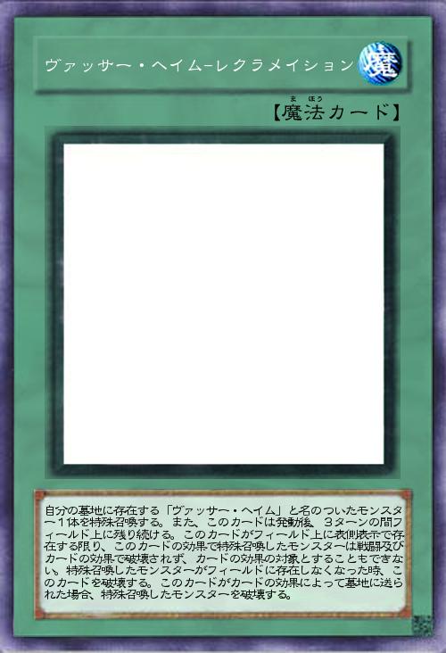 | 自分の墓地に存在する「ヴァッサー・ヘイム」と名のついたモンスター1体を特殊召喚する。また、このカードは発動後、3ターンの間フィールド上に残り続ける。このカードがフィールド上に表側表示で存在する限り、このカードの効果で特殊召喚したモンスターは戦闘及びカードの効果で破壊されず、カードの効果の対象とすることもできない。特殊召喚したモンスターがフィールドに存在しなくなった時、このカードを破壊する。このカードがカードの効果によって墓地に送られた場合、特殊召喚したモンスターを破壊する。 | |||