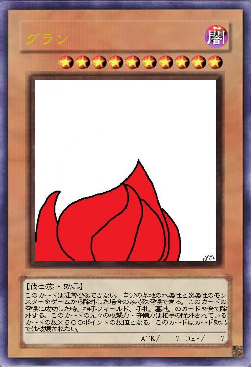 | このカードは通常召喚できない。自分の墓地の水属性と炎属性のモンスターをゲームから除外した場合のみ特殊召喚できる。このカードの召喚に成功した時、相手フィールド、手札、墓地、のカードを全て除外する。このカードの元々の攻撃力・守備力は相手の除外されているカードの数×500ポイントの数値となる。このカードはカード効果では破壊されない。 | |||