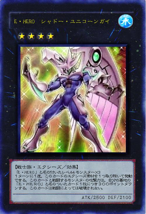 | 「E・HERO」と名の付いたレべル4モンスター×3 1ターンに1度、このカードのエクシーズ素材を1つ取り除いて発動できる。このカードと戦闘するモンスタ-の攻撃力は、自分の墓地の「E・HERO」と名のついたカード1枚につき300ポイントダウンする。このカードは戦闘によっては破壊されない。 | |||