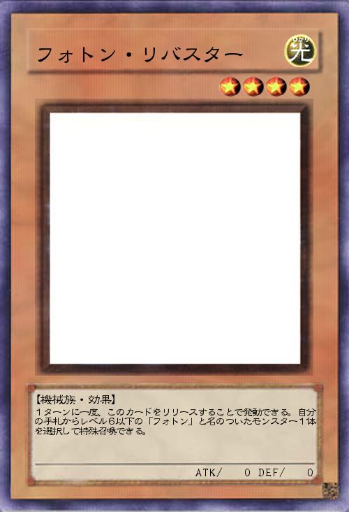 | 1ターンに一度、このカードをリリースすることで発動できる。自分の手札からレベル6以下の「フォトン」と名のついたモンスター1体を選択して特殊召喚できる。 | |||