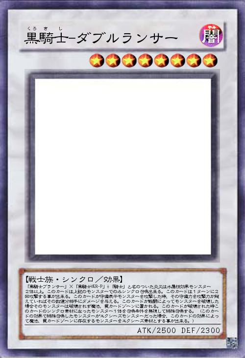 | 「黒騎士ブランサー」×「黒騎士VER-P」+「騎士」と名のついた炎又は水属性効果モンスター2体以上。このカードは上記のモンスターでのみシンクロ召喚出来る。このカードは1ターンに2回攻撃する事が出来る。このカードが守備表示モンスターを攻撃した時、その守備力を攻撃力が超えていればその数値分相手にダメージを与える。このカードが戦闘によってモンスターを破壊した場合そのモンスターは破壊されず魔法、罠カードゾーンに置かれる。このカードが破壊された時このカードのシンクロ素材になったモンスター1体を召喚条件を無視して特殊召喚する。(このカードの効果で特殊召喚したモンスターがエクシーズモンスターだった場合、このカードの効果によって魔法、罠カードゾーンに存在するモンスターをエクシーズ素材とする事が出来る。) | |||
