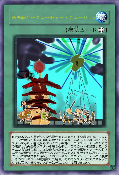 | 自分のエクストラデッキから融合モンスターを1つ選択する。このカードを発動した前に召喚した融合モンスターによって決められたモンスターを手札・墓地からゲームから除外し、エクストラデッキからその選択した融合モンスターを融合召喚し、このカードを装備する。ゲームから除外されている決められたモンスターが墓地・フィールド上に戻った場合、その融合モンスターをエクストラデッキに戻す。このカードが破壊された場合、そのモンスターをエクストラデッキに戻す。そのモンスターが破壊された場合、そのモンスターはエクストラデッキに戻り、そのモンスターはデュエル中使用できない。 | |||