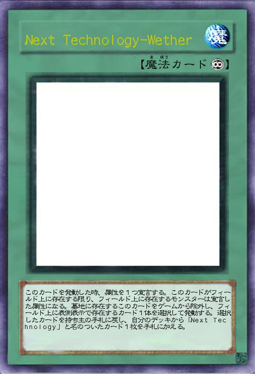 | このカードを発動した時、属性を1つ宣言する。このカードがフィールド上に存在する限り、フィールド上に存在するモンスターは宣言した属性になる。墓地に存在するこのカードをゲームから除外し、フィールド上に表側表示で存在するカード1体を選択して発動する。選択したカードを持ち主の手札に戻し、自分のデッキから「Next Technology」と名のついたカード1枚を手札に加える。 | |||