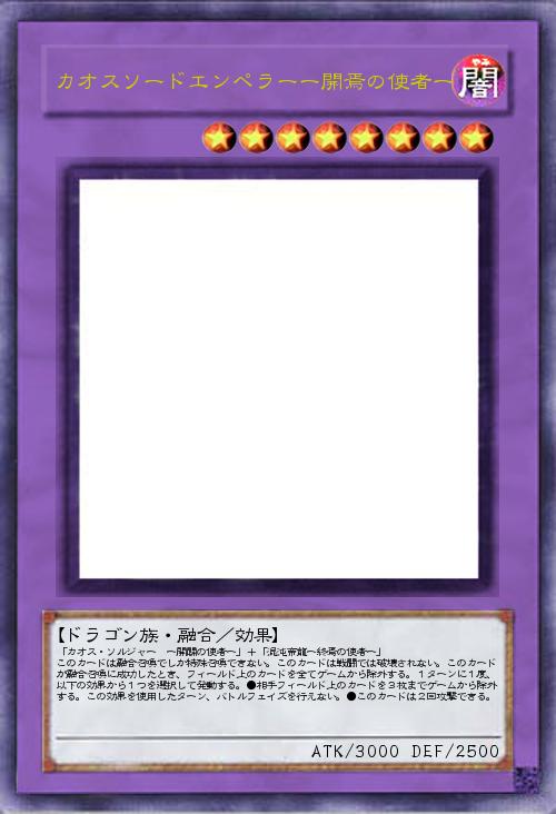 「カオス・ソルジャー ー開闢の使者ー」+「混沌帝龍ー終焉の使者ー」 このカードは融合召喚でしか特殊召喚できない。このカードは戦闘では破壊されない。このカードが融合召喚に成功したとき、フィールド上のカードを全てゲームから除外する。1ターンに1度、以下の効果から1つを選択して発動する。●相手フィールド上のカードを3枚までゲームから除外する。この効果を使用したターン、バトルフェイズを行えない。●このカードは2回攻撃できる。 |