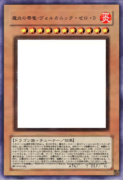 | このカードは通常召喚できない。自分の手札・墓地モンスター・自分フィールド上にモンスターが存在しない場合のみこのカードを特殊召喚する事が出来る。相手ターンで戦闘を行って、戦闘ダメージを受けた時、このカードを特殊召喚する事が出来る。特殊召喚に成功した時、このカード以外のすべてのカードをゲームから除外する。除外した枚数x800ポイントがお互いのライフにダメージを与える。一ターンに一度、デッキ・手札からレベル8以下の炎族モンスターを特殊召喚する事が出来る。このカードがある限り、炎属性モンスターの攻撃力は2倍となる。このカードがある限り、炎属性モンスターと戦闘を行う場合、戦闘ダメージを無効にし、全てライフ回復になる。このカードはフィールド上に一体までしか存在出来ず、このカードを特殊召喚してから9ターン後、このカードを破壊し、10000ポイントのライフを払う。払わなければゲームに敗北するか相手が勝つか | |||